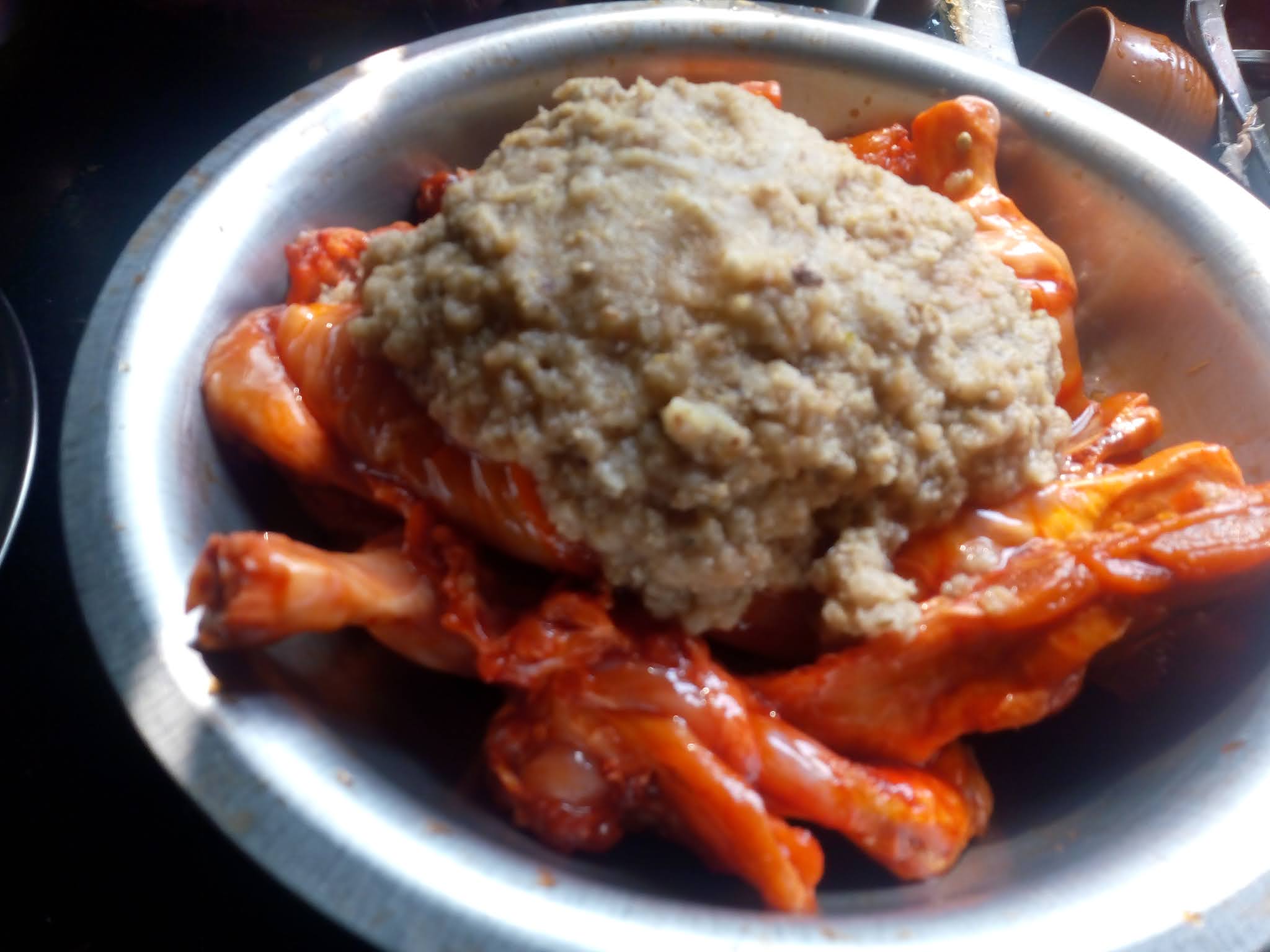 Wash and clean chicken and marinate with salt,lemon juice and tandoori orange color and keep aside for 30 mins