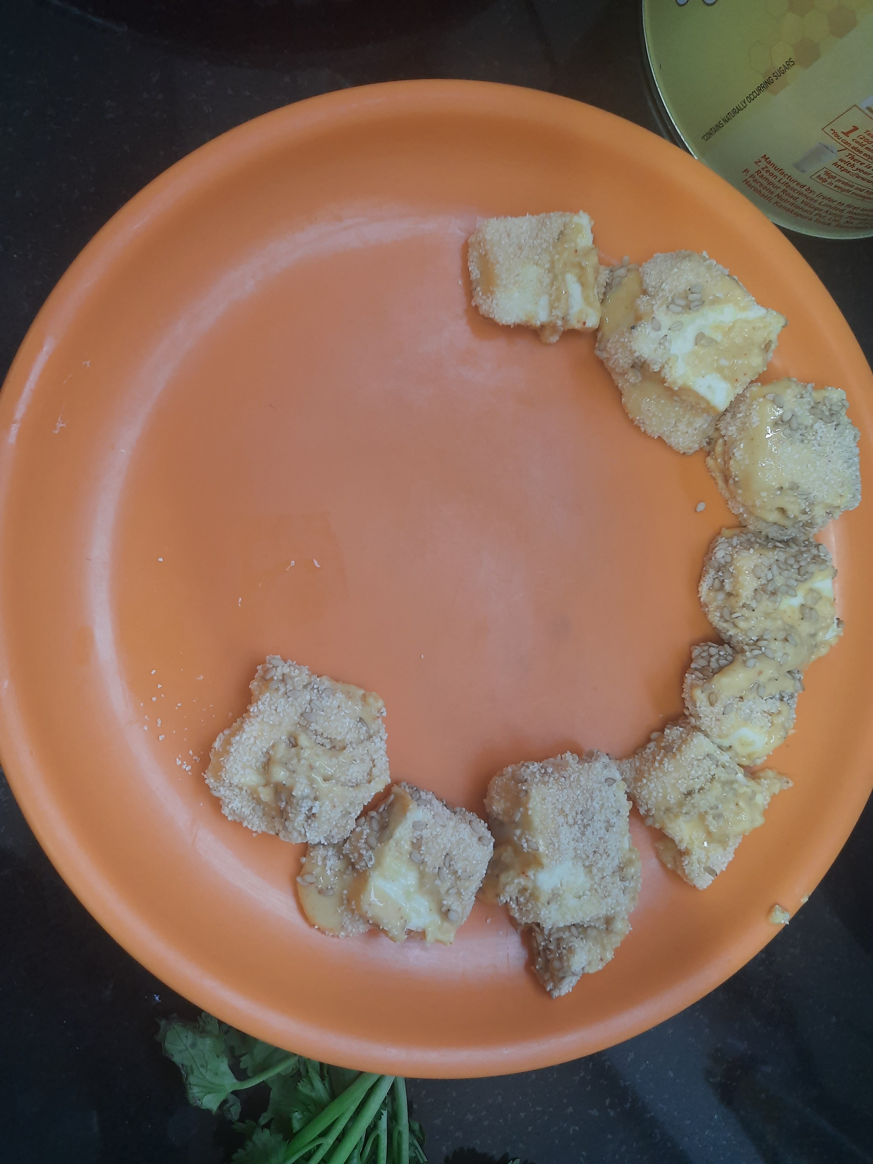 Heat the oil in a wok.Dip the paneer pieces into the batter and coat them in the mixture of suji and til b